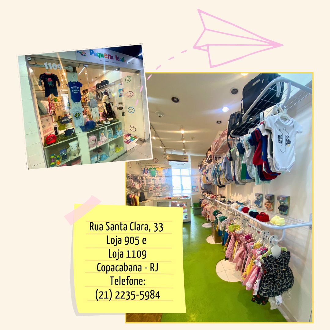 Temos três opções de atendimento, na loja física localizada na Rua Santa Clara, 33 loja 905 (1 a 16 anos) e Loja 1109 ( do recem nascido até 12 meses), localizada no coração de Copacabana – RJ. Pelo Whatsapp é possível comprar ou solicitar envio de presentes via delivery. Outra opção que é sucesso de vendas, a mala delivery Pequena Idade, processo simples e rápido de solicitar o envio de várias peças de roupa a sua casa, ela trás muita comodidade e conforto aos nossos clientes. Sem compromisso de compra mínima